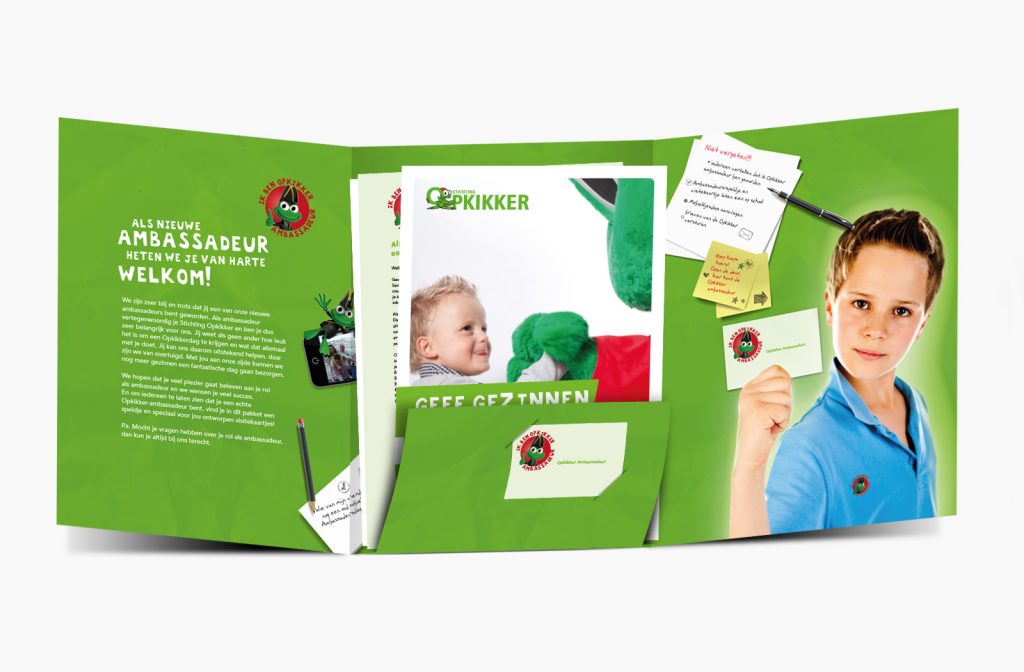 Het pakket bevat een algemene folder, brieven, visitekaartjes en leuke gadgets. De ambassadeurs kunnen de brieven versturen. Hiermee nodigen ze bedrijven, scholen en anderen uit om het online profiel van de ambassadeur op de website van Stichting Opkikker te bekijken en zo eventueel deel te laten nemen aan acties of direct te doneren. Het kind kan vanuit zijn of haar profiel ook iedereen direct mailen om deel te laten nemen aan acties. Het profiel wordt met diverse foto’s en video’s van alle opkikkerdagen gevuld. Zo kunnen bedrijven, scholen en anderen een goede indruk krijgen wat de Stichting Opkikker doet voor de kinderen en ouders.